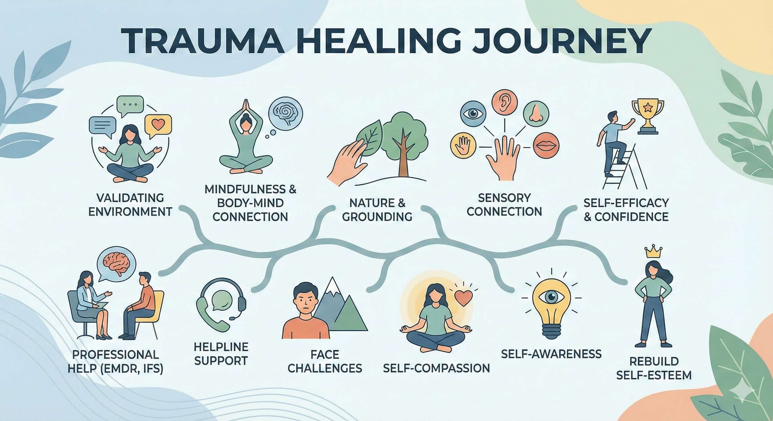 Utilise professional health assistance especially trauma specific. Some of the recommended trauma-informed modalities include: EMDR, IFS, mindfulness practise